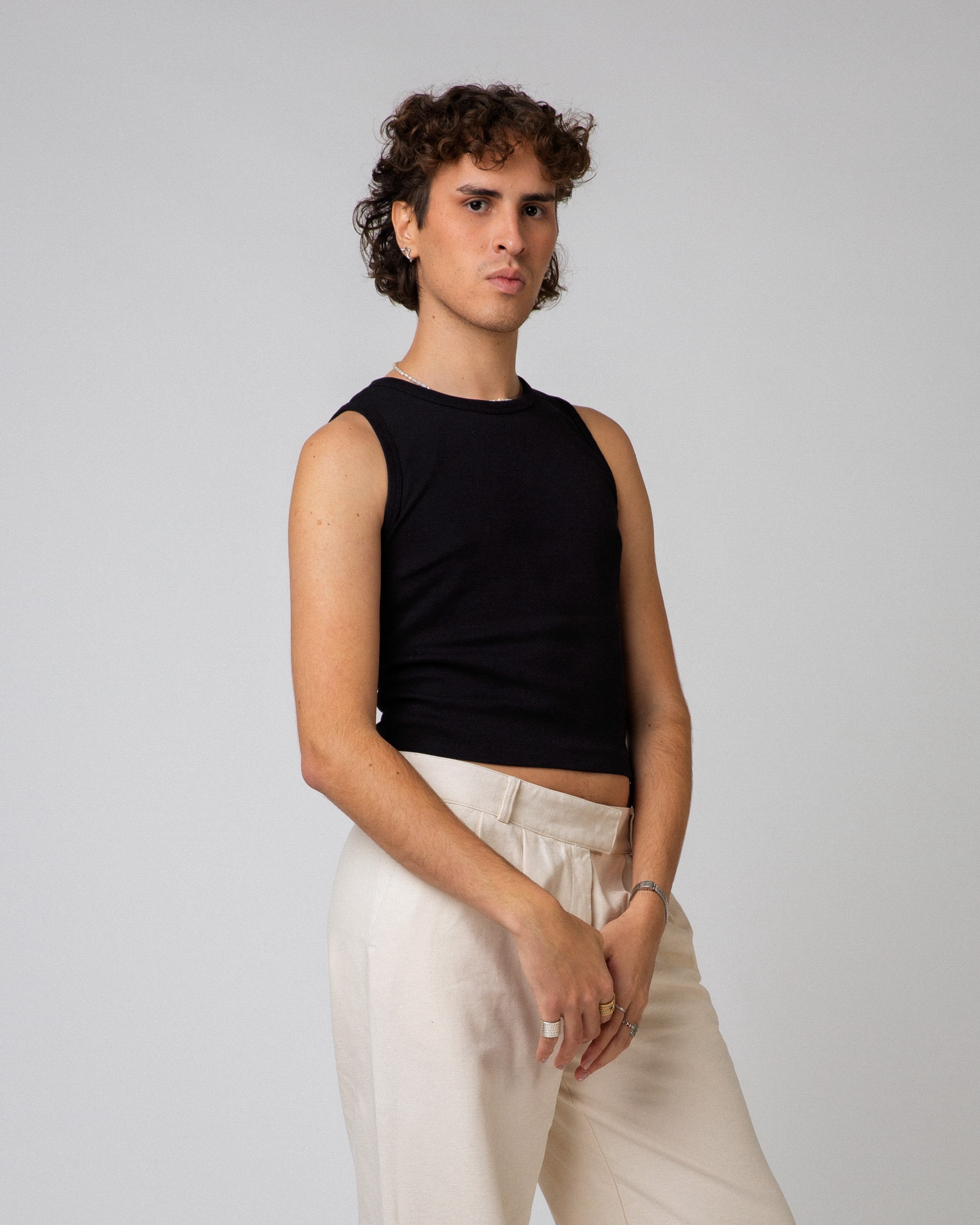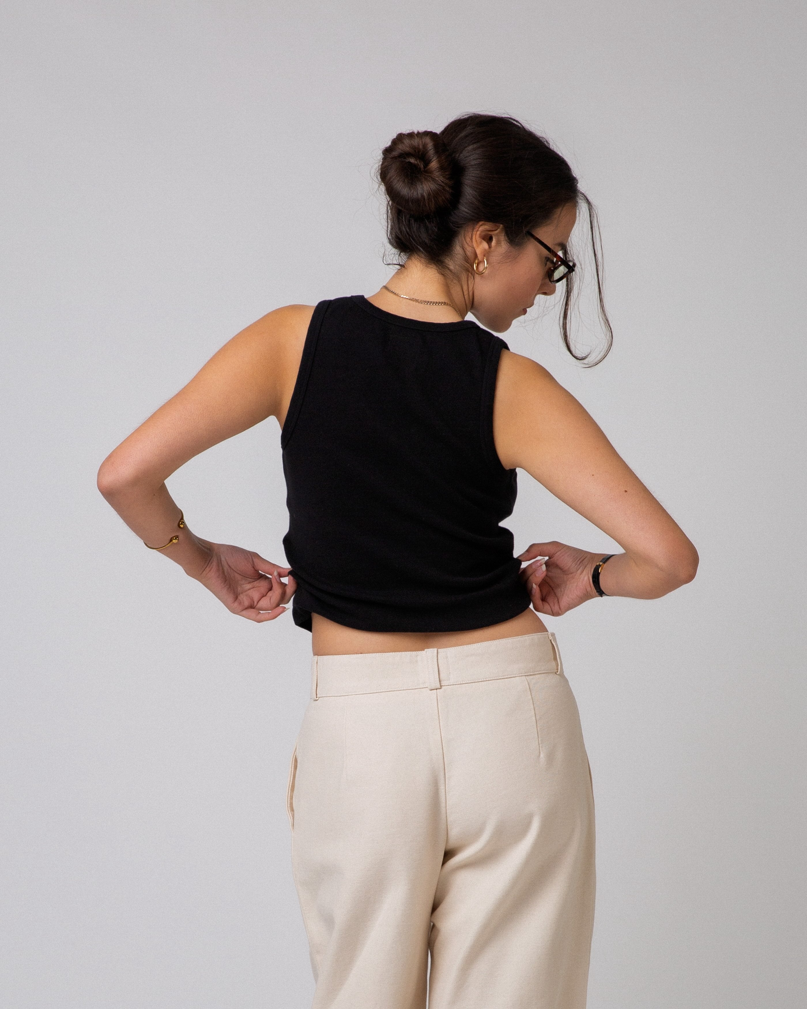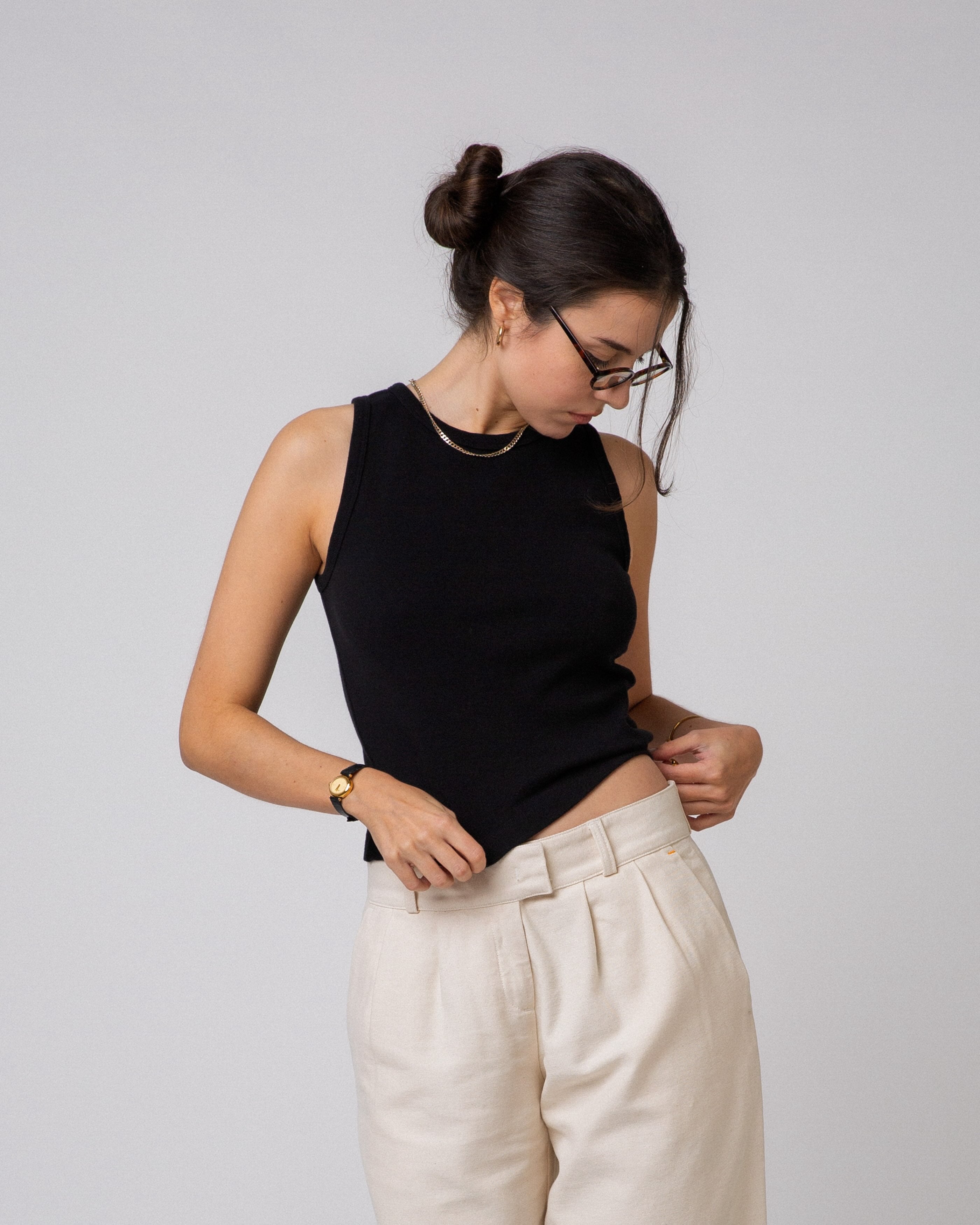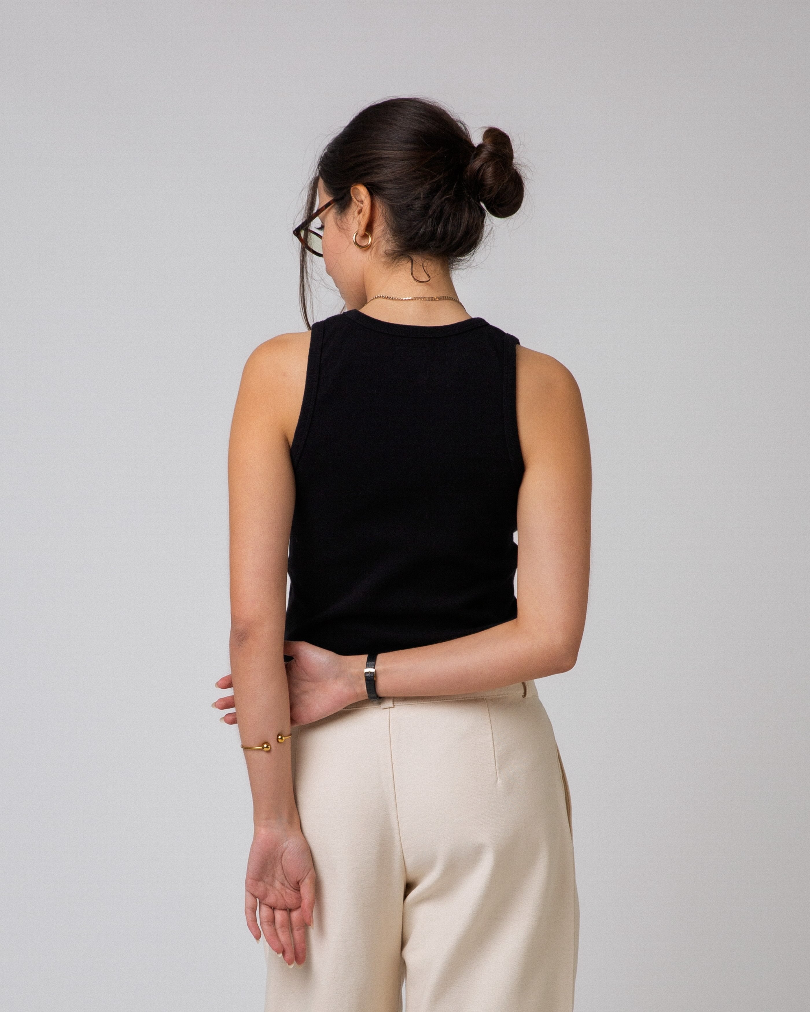 We wanted something more than a basic - a tank that holds its shape and feels lush. Inspired by classic men’s cuts, reworked with thicker shoulders, a higher neckline, and a length that hits just at the hip.