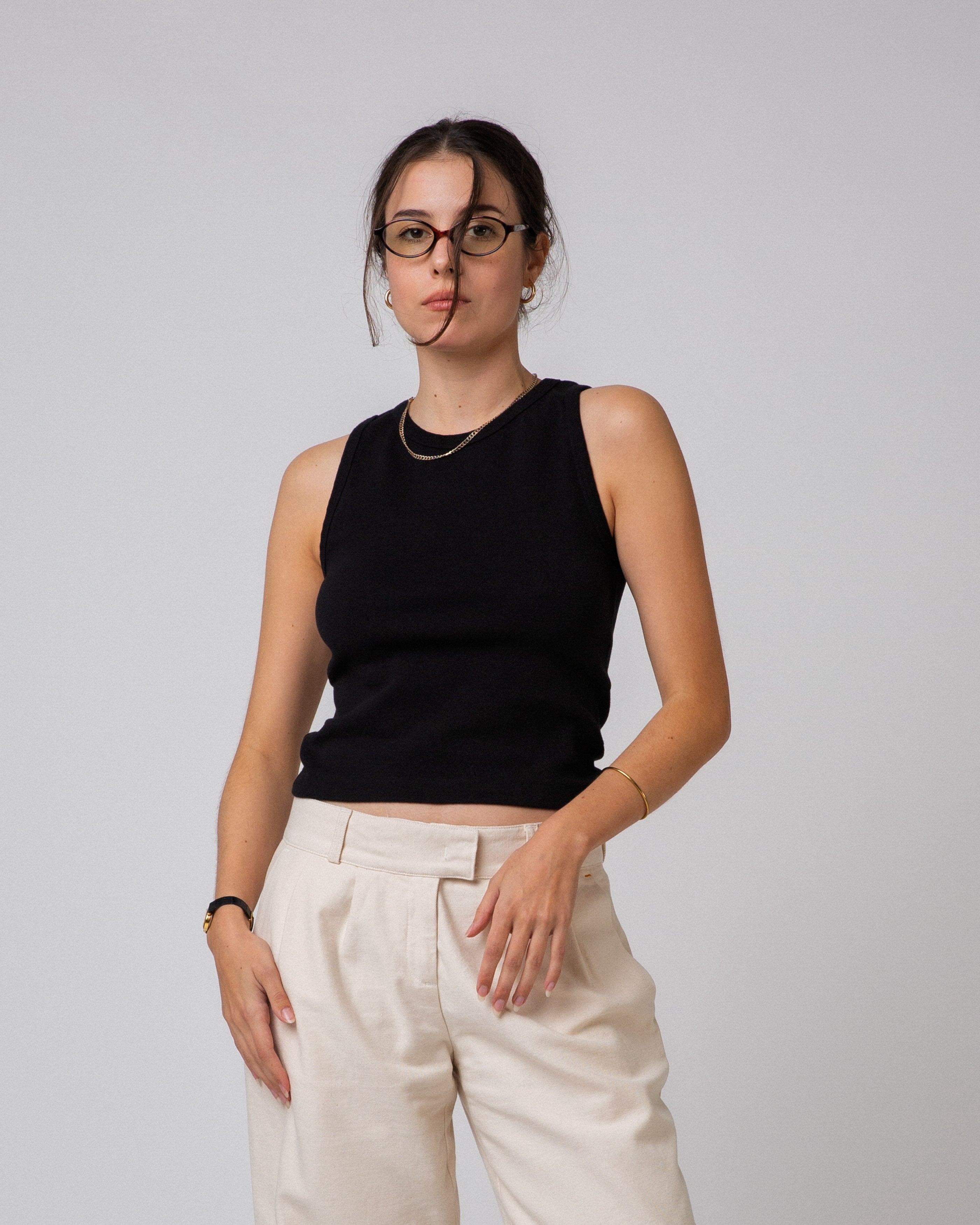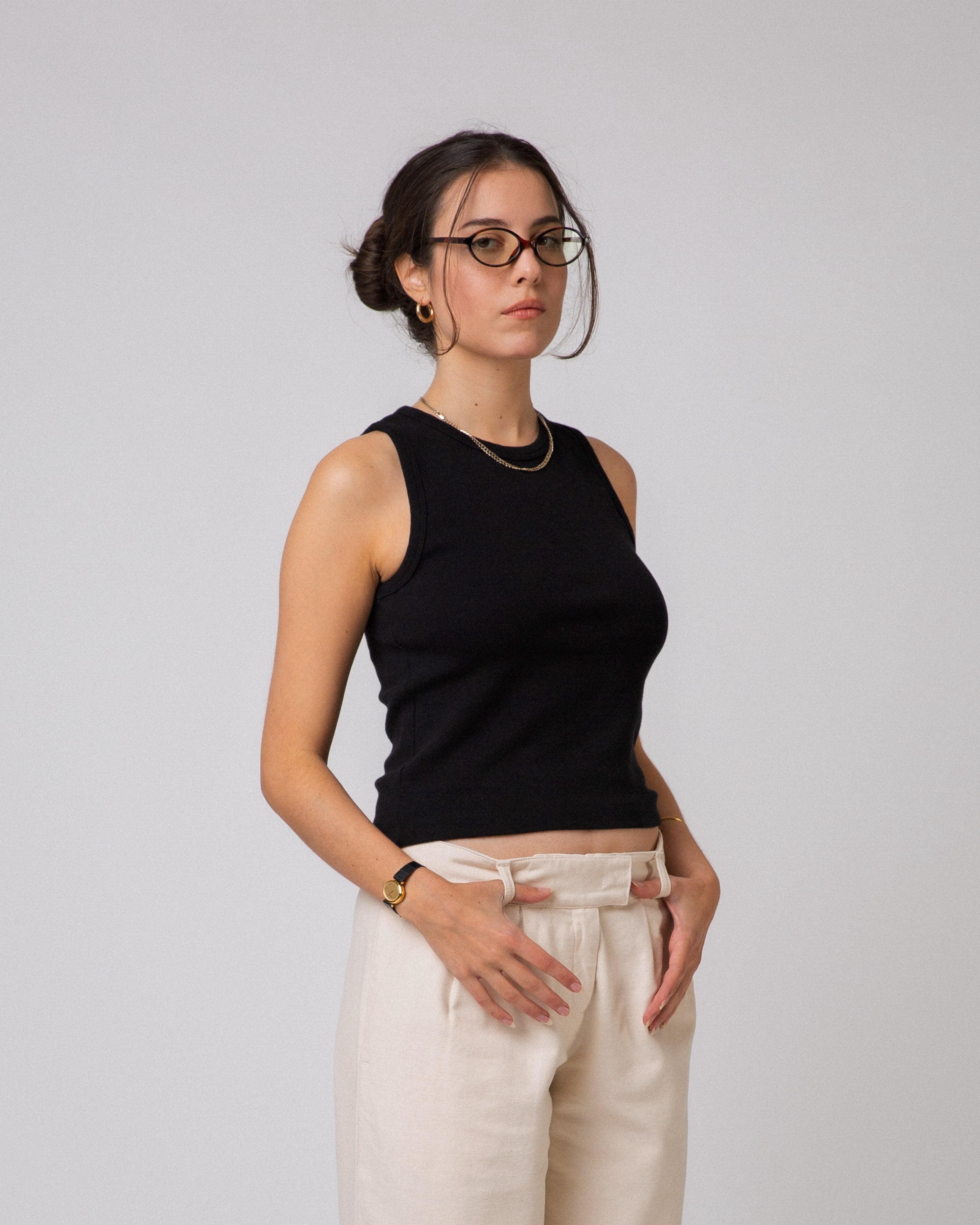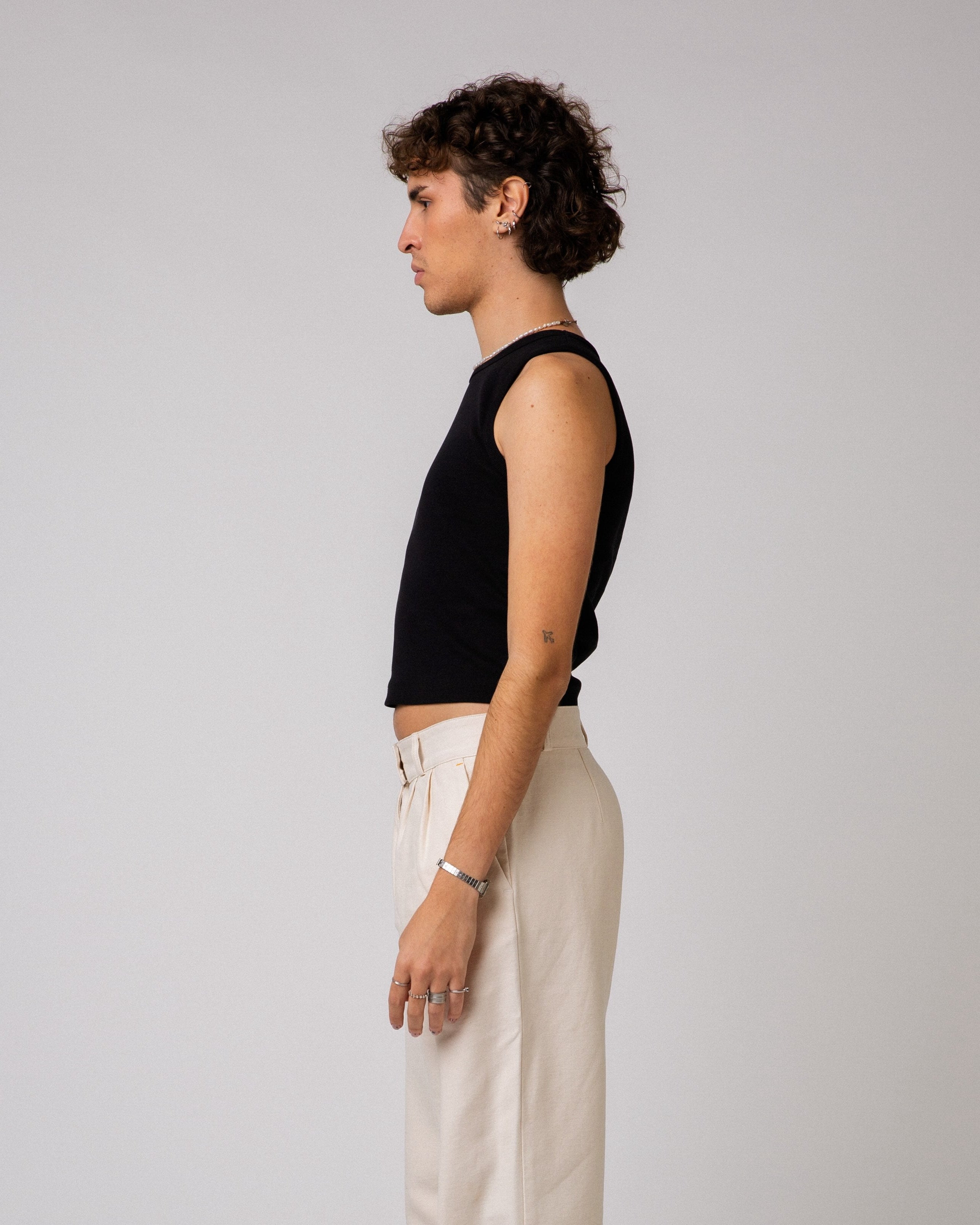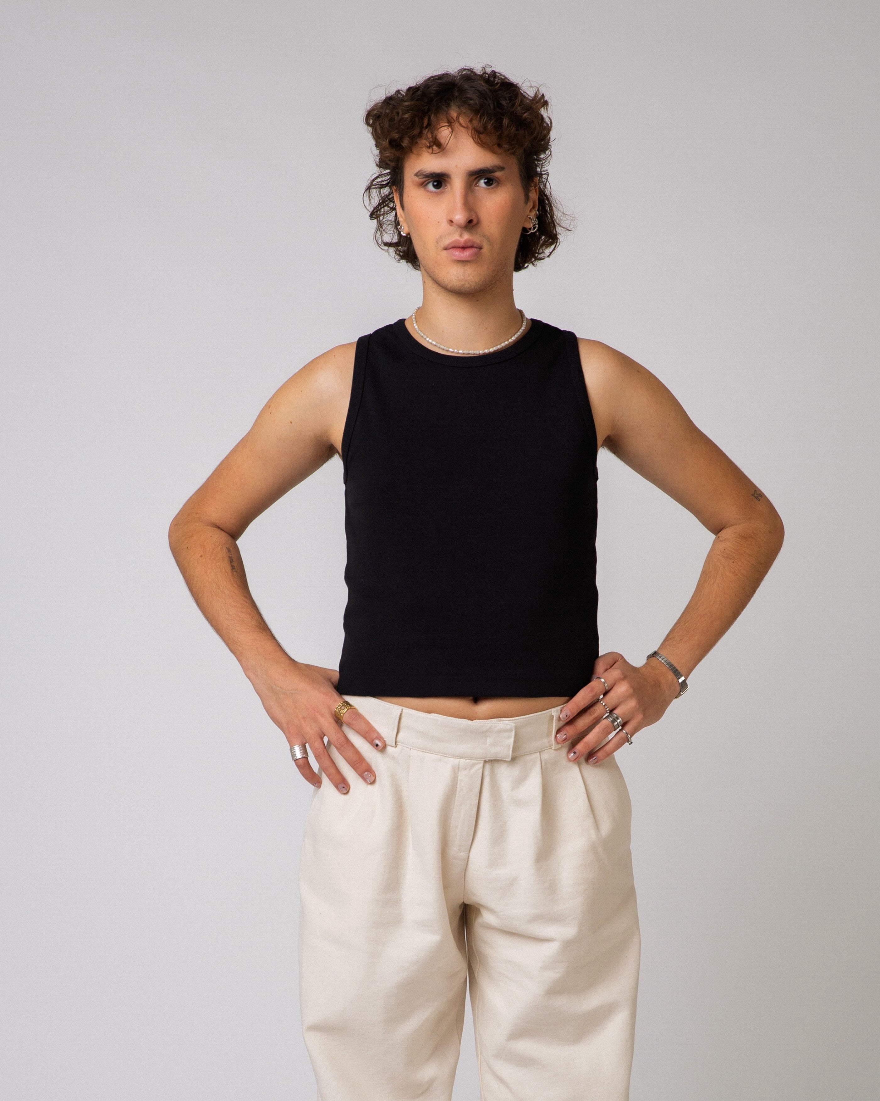 We wanted something more than a basic - a tank that holds its shape and feels lush. Inspired by classic men’s cuts, reworked with thicker shoulders, a higher neckline, and a length that hits just at the hip.